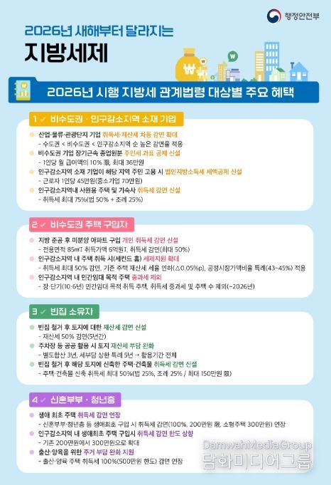주요 내용은 인구감소지역 집중 지원 등 지역별 차등을 둔 세제 감면 지원 체계를 마련해 지역 균형발전을 촉진한다.