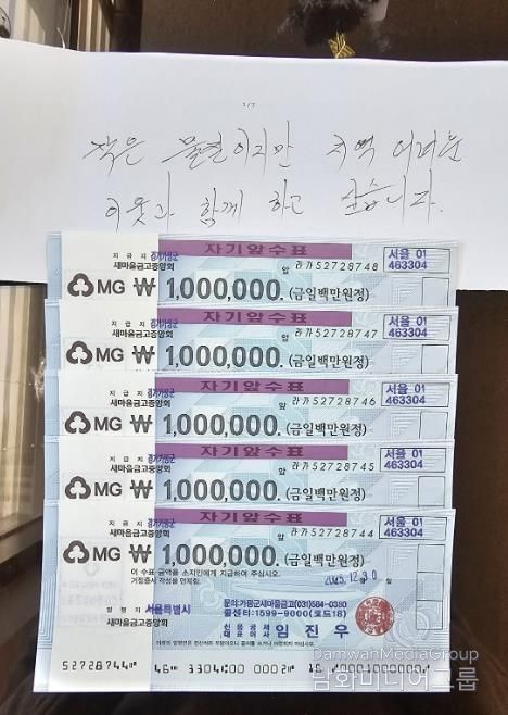 청평면의 ‘얼굴 없는 천사’로 알려진 이 기부자는 2016년부터 현재까지 10년째 익명 기부를 이어오며 매년 빠짐없이 성금을 전달해 오고 있다. 익명의 기부자가 전달한 봉투에는 “작은 물질이지만 지역의 어려운 이웃과 함께 하고 싶습니다.”라는 내용과 함께 100만 원권 수표 5장이 담겨 있었다.