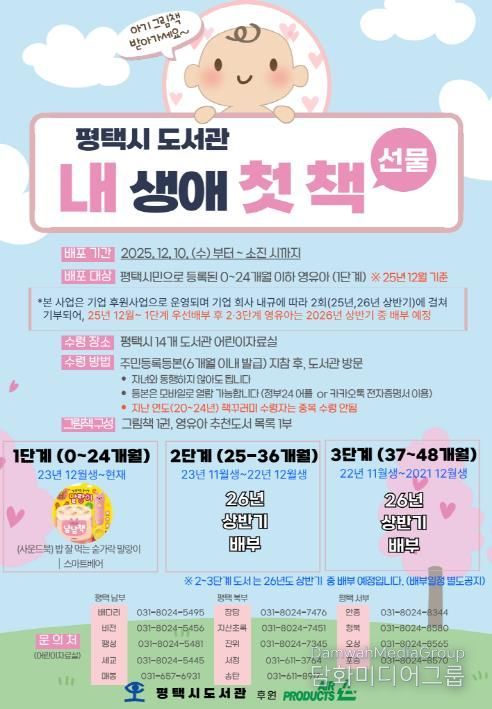 올해는 12월 기준 24개월 이하의 평택시 영유아를 대상으로 먼저 사업을 진행하며, 25개월부터 48개월 영유아를 위한 책 선물은 2026년 상반기 중 배부할 예정이다.