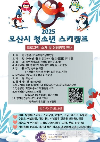 이권재 오산시장은 “이번 겨울 스키캠프는 청소년들이 자연 속에서 다양한 체험활동을 통해 협동심과 도전정신을 기를 수 있는 소중한 기회가 될 것”이라며, “앞으로도 청소년의 건강한 성장과 건전한 여가활동을 지원하는 체험형 프로그램을 지속적으로 확대해 나가겠다”고 말했다.