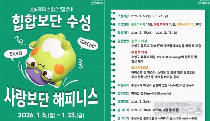 시민행정신문 강갑수 기자 | 대구 수성구는 주민이 직접 참여하는 소통 중심의 구정 홍보를 확대하기 위해‘2026년 해피니스 홍보단’을 이달 5일부터 23일까지 모집한다.