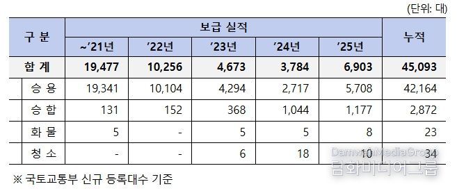 지난해(2025년) 수소차는 전년(2024년)에 비해 182% 늘어난 6,903대가 보급됐다. 특히 수소 승용차는 7년 만에 신차가 출시됨에 따라 전년도 대비 210%가 증가한 5,708대를 기록했다.