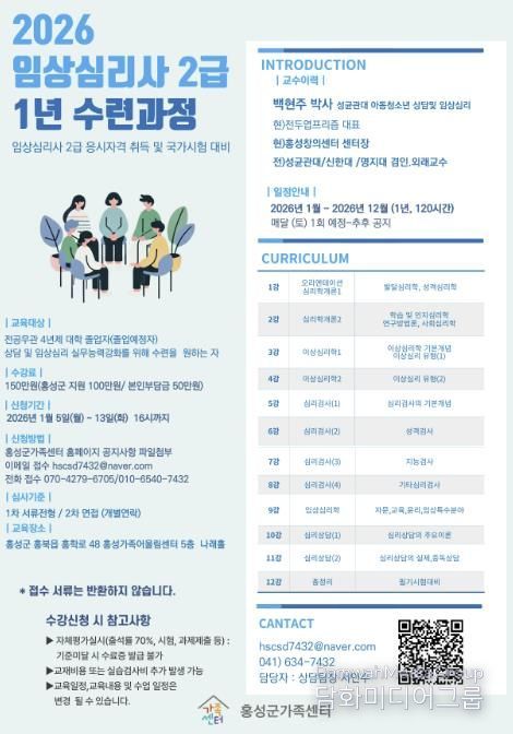 박미성 가정행복과장은 “이번 과정을 통해 배출될 전문가들이 우리 지역 아동들의 심리적 안전망을 구축하는 핵심 주역이 될 것으로 확신한다”라며, “아이들의 밝고 건강한 성장을 위해 함께 발맞춰 나갈 군민 여러분의 사명감 있는 도전을 기다린다”고 말했다.