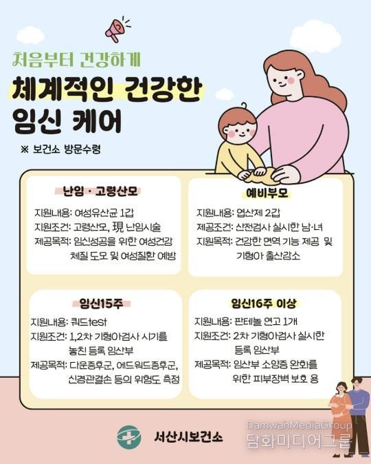 김용란 서산시 보건소장은 “임신 단계별로 꼭 필요한 지원을 체계적으로 제공해 예비부모와 임산부의 건강을 세심하게 살필 것”이라며 “앞으로도 건강한 임신·출산을 위한 맞춤형 모자보건 서비스를 지속적으로 확대해 나가겠다”라고 말했다.