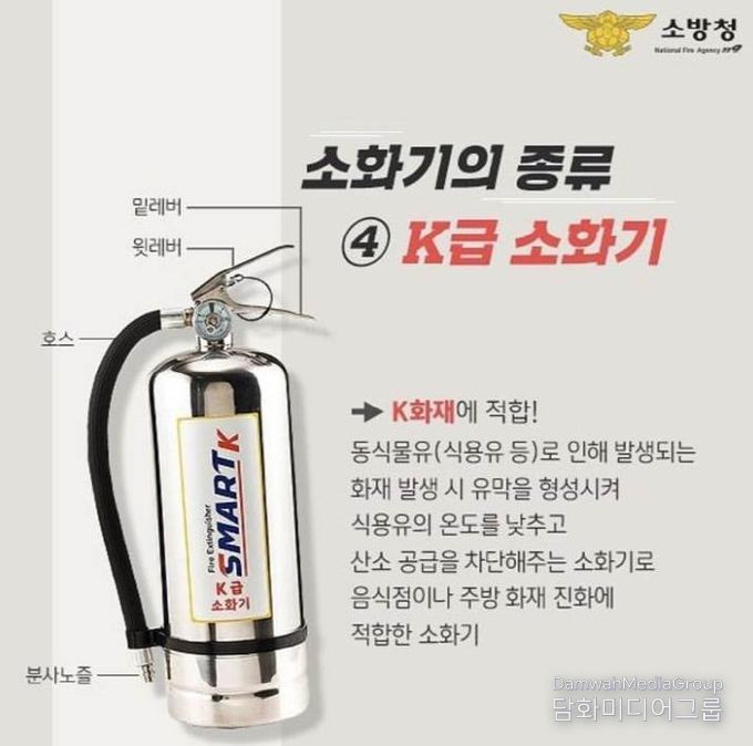 K급 소화기는 식용유 등 동·식물성 유지로 인해 발생하는 주방 화재에 적합한 소화기로, 화재 발생 시 유막을 형성해 산소 공급을 차단하고 기름의 온도를 낮춰 재발화를 방지하는 역할을 한다. 특히 주방 화재에 물을 사용할 경우 불길이 확산될 위험이 있어 각별한 주의가 필요하다.