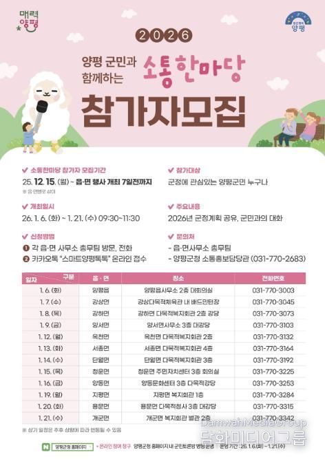 한편, ‘2026년 군민과 함께하는 소통한마당’은 △6일 양평읍 △7일 강상면 △8일 강하면 △9일 양서면 △12일 옥천면 △13일 서종면 △14일 단월면 △15일 청운면 △16일 양동면 △19일 지평면 △20일 용문면 △21일 개군면 순으로 개최된다.