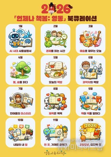 시민행정신문 기자 | 영동교육도서관은 2026년 1월부터 12월까지 '언제나 책봄: 영동' 북큐레이션을 운영한다. 매월 주제에 맞는 대상별 추천도서 32권을 전시하여 도서관 이용자에게 다양한 독서 경험을 제공하기 위함이다.