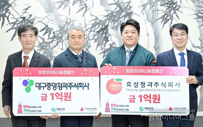 시민행정신문 강갑수 기자 | 대구농수산물도매시장 법인 대구중앙청과㈜(대표 이용우, 이상윤)와 효성청과㈜(대표 김형수)는 1월 5일 대구광역시청 동인청사 접견실에서 대구사회복지공동모금회를 통해 총 2억 원(각 1억 원)의 희망 나눔 성금을 전달했다.