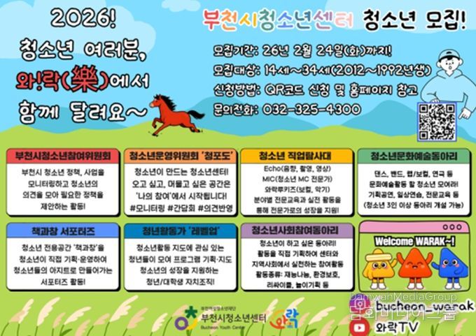 시민행정신문 기자 | 부천여성청소년재단이 운영하는 부천시청소년센터는 2026년 청소년 참여자치조직 및 동아리 활동에 참여할 청소년·청년을 모집한다. 부천시청소년센터는 청소년의 자치 역량 강화와 주도적 참여 확대를 위해 참여, 문화예술, 진로직업탐색 등 다양한 활동을 운영하고 있다.