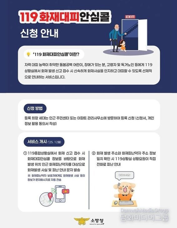 ‘119 화재대피안심콜 서비스’는 돌봄 공백 아동, 장애인, 고령자, 독거노인 등 화재 상황에서 스스로 대피가 어려운 대상자를 사전에 등록하면 화재 발생 시 119종합상황실의 신고 접수 단계부터 해당 정보를 확인해 신속하고 안전한 대피를 돕는 맞춤형 안전지원 서비스다.