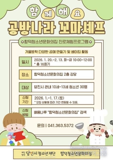 시민행정신문 강갑수 기자 | 합덕청소년문화의집은 방학 기간 중 공방나라 꼬마셰프 진로체험프로그램 2026년 1월 20일 화요일부터 2월 13일 금요일까지 화~금 10:00~12:00 총 16회기 다양한 공예 및 베이킹 체험을 희망하는 당진시 관내 청소년 초등학생 10세~13세 30명을 모집한다.