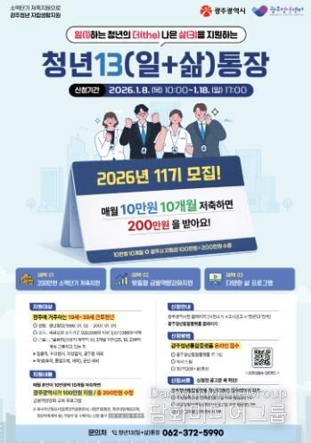 시민행정신문 강갑수 기자 | 광주광역시는 일(1)하는 청년의 더 나은 삶(3)을 지원하는 ‘청년13(일+삶)통장’ 제11기 참여자를 8일부터 18일까지 모집한다.