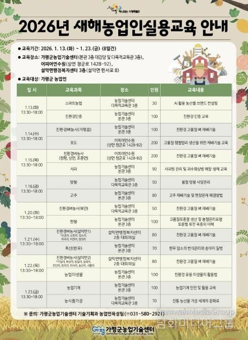 시민행정신문 강갑수 기자 | 가평군농업기술센터가 농업인의 영농 역량 강화를 위해 ‘2026년 새해농업인실용교육’을 오는 1월 13일부터 23일까지 실시한다.