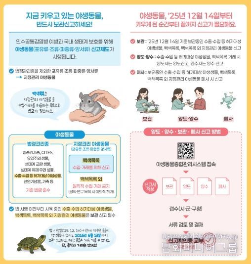 신고는 기후에너지환경부가 운영하는 ‘야생동물종합관리시스템’을 통해 제도에 대한 상세 내용 확인부터 접수까지 온라인으로 간편하게 처리할 수 있다.