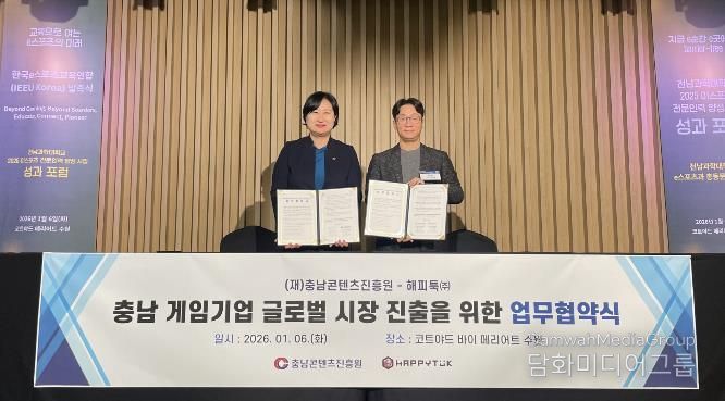 시민행정신문 강갑수 기자 | 충남콘텐츠진흥원이 대만의 퍼블리셔 해피툭과 충남 게임기업 대만시장 판로개척 및 콘텐츠 교류 지원을 위한 업무협약을 체결했다.