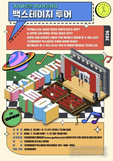 시민행정신문 강갑수 기자 | 구리문화재단은 〈무대 기술 체험 백스테이지 투어 프로그램〉 참가자를 오는 1월 13일 오전 9시부터 1월 27일 오후 6시까지 재단 홈페이지를 통해 선착순 모집한다고 밝혔다.
