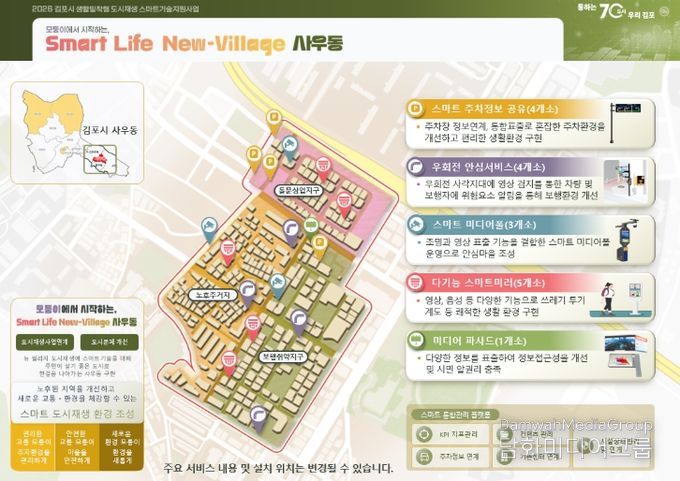 김포시는 노후 주거지와 원도심을 중심으로 생활밀착형 스마트기술을 접목한 ‘사우동 뉴빌리지’ 도시재생 사업을 추진한다. 이 사업은 지역별 특성과 주민 요구를 반영해 맞춤형 생활밀착형 스마트기술을 도입하는 것이 특징이다.