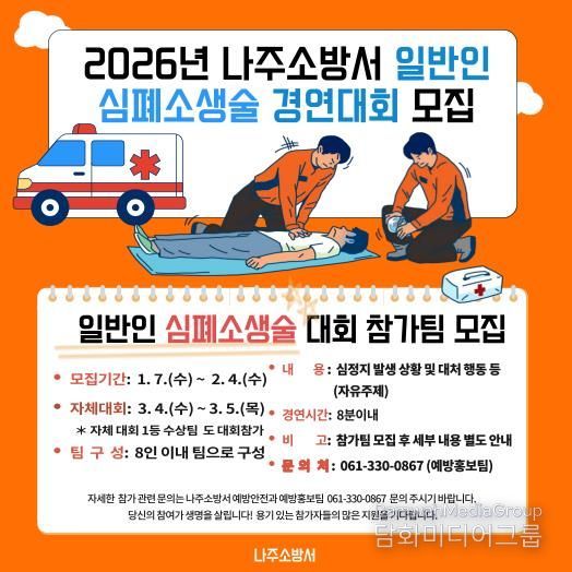 시민행정신문 강갑수 기자 | 나주소방서는 도민의 심폐소생술 시행률 향상과 생명존중 문화 확산을 위해 2026년 제15회 ‘일반인 심폐소생술 경연대회’ 에 참가할 대표팀을 모집한다고 밝혔다.