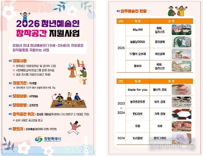 ▲접수 기간은 1월 14일부터 1월 28일 18시까지이며, 자세한 내용은 창원시 홈페이지 고시공고 '2026년 청년예술인 창작공간 지원사업』 입주예술인 공모에서 확인할 수 있다.