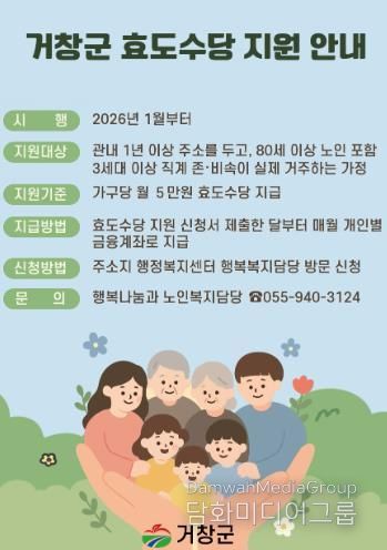 시민행정신문 강갑수 기자 | 거창군은 경로효친의 건전한 가족제도 정착과 효 문화 확산을 위해 효도수당 지원 대상을 확대하고, 2026년 1월부터 본격 지급에 나선다.