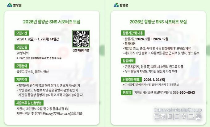 시민행정신문 강갑수 기자 | 함양군은 군민의 눈높이에서 소통하며 군의 생생한 현장 소식을 전달할 ‘2026년 함양군 누리소통망(SNS) 서포터즈’를 모집한다고 밝혔다.