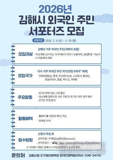 모집 대상은 김해시에 거주하며 한국어와 자국어 소통이 원활하고, SNS를 활발히 이용하는 외국인주민(귀화자 포함)이다. 특히 올해는 전자우편 접수와 더불어 김해시 인구정책 종합정보 플랫폼 ‘김해아이가(家)’를 통한 온라인 접수를 추가해 신청 편의성을 높였다.