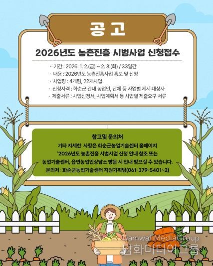 시민행정신문 강갑수 기자 | 화순군은 “소득이 높은 부유 농촌” 실현과 화순 농업 경쟁력 강화를 위해 ‘2026년도 농촌진흥 시범사업’ 신청을 2026년 2월 3일까지 신청받는다고 밝혔다.