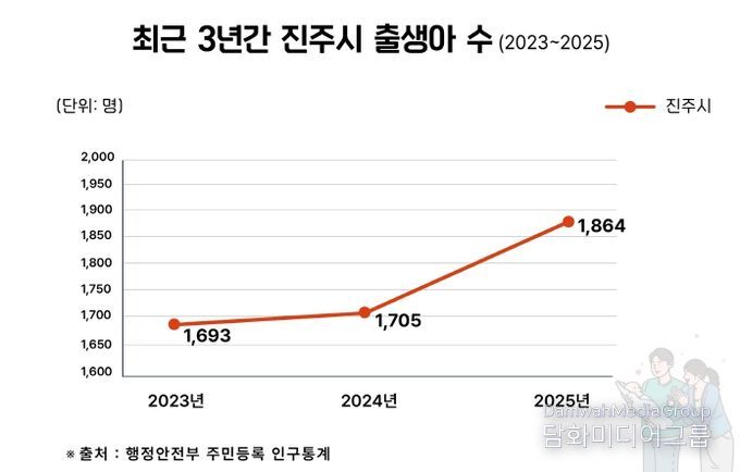 지난 5일 행정안전부의 주민등록 인구통계 발표에 따르면 진주시의 주민등록 출생아 수는 2023년 1693명으로 저점을 찍은 후, 2024년 1705명, 2025년 1864명으로 뚜렷한 증가세를 보였다.