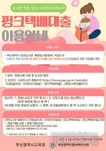 서비스 이용을 희망하는 이용자는 사하도서관 홈페이지 ‘핑크택배대출’ 게시판을 통해 온라인으로 신청하거나, 도서관 어린이자료실을 방문해 신청할 수 있다.