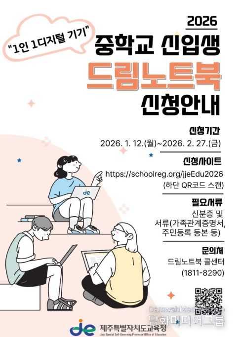 시민행정신문 기자 | 제주특별자치도교육청은 12일부터 인공지능(AI) 대전환 시대를 맞아 도내 학생들의 디지털 학습 역량을 강화하기 위해 중학교 신입생을 대상으로 ‘2026학년도 드림노트북 지원(대여) 사업’ 신청을 받는다.