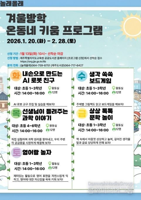 시민행정신문 기자 | 제주도교육청 제주도서관은 겨울방학을 맞아 20일부터 2월 28일까지 초등학생들을 대상으로 ‘2026년 놀래올래 겨울방학 온동네 키움 프로그램’을 운영한다.