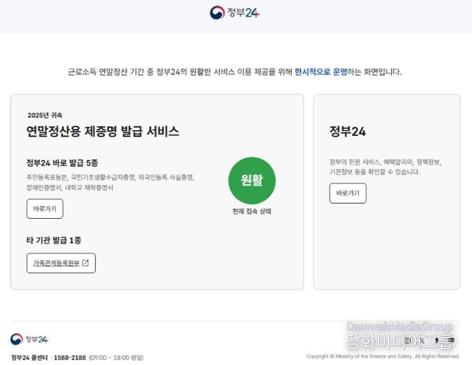 행정안전부는 연말정산 기간에 이용자 접속이 급증할 것에 대비해 전용창구를 운영하고, 접속 폭주 시 순번 대기 표시기능을 적용하는 등 이용자 불편을 최소화하여 정부24 운영의 안정성을 높인다는 계획이다.