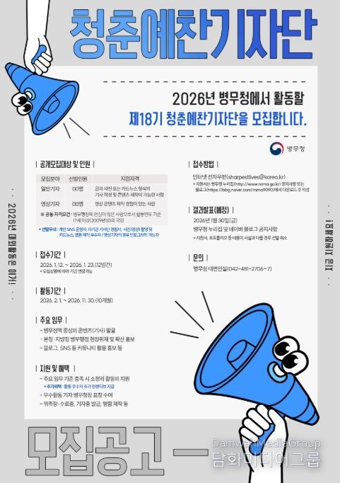 시민행정신문 강갑수 기자 | 병무청은 2026년에 활동할 제18기 청춘예찬기자단을 2026년 1월 12일부터 1월 23일까지 공개 모집한다.