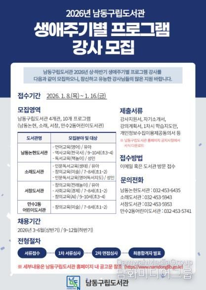 시민행정신문 강갑수 기자 | 인천시 남동구 구립도서관은 3~12월까지 운영하는 ‘2026년 상·하반기 생애주기별 프로그램’에 함께 할 프로그램 강사를 공개 모집한다고 12일 밝혔다.