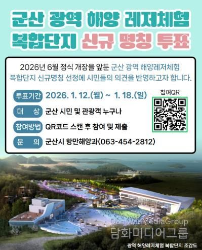 군산시 관계자는 “군산 광역 해양레저체험 복합단지는 시민을 위한 공공시설인 만큼, 명칭 선정 과정에서도 시민의 의견을 폭넓게 반영하고자 한다.”라며 “시민 참여 선호도 조사 40%, 심사위원 평가 60%의 혼합형 심사 방식을 통해 공정성과 전문성을 함께 확보한 만큼, 많은 시민의 적극적인 참여를 기대한다.”라고 밝혔다.