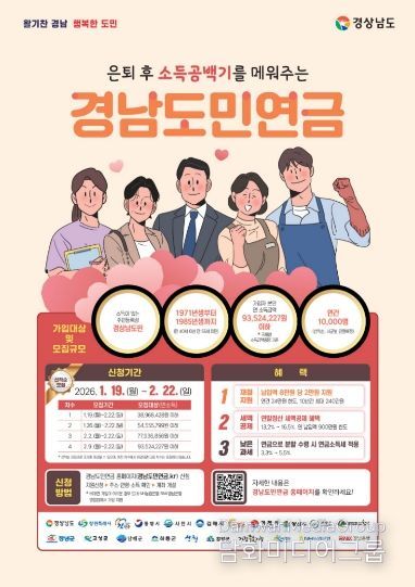 시민행정신문 강갑수 기자 | 양산시는 은퇴 후 국민연금 수령 전까지의 소득 공백기 해소와 안정적인 노후 준비를 지원하기 위한 '경남도민연금'가입자 모집을 1월 19일부터 시작한다고 밝혔다.