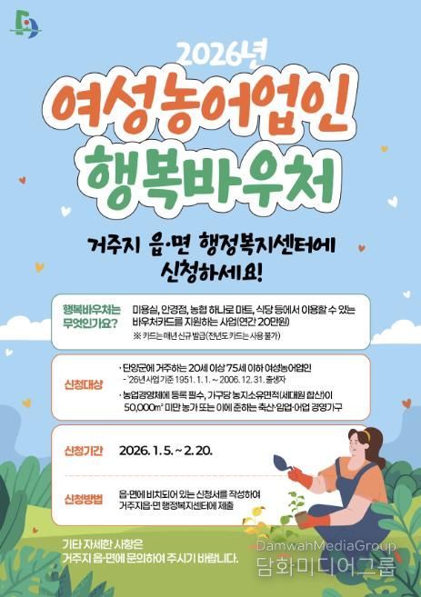 군 관계자는 “여성농어업인은 농촌 현장에서 중요한 역할을 담당하고 있음에도 복지 혜택에서는 상대적으로 어려움이 있었다”며 “이번 행복바우처 사업이 여성농어업인의 생활 안정과 삶의 질 향상에 실질적인 도움이 되길 바란다”고 말했다.