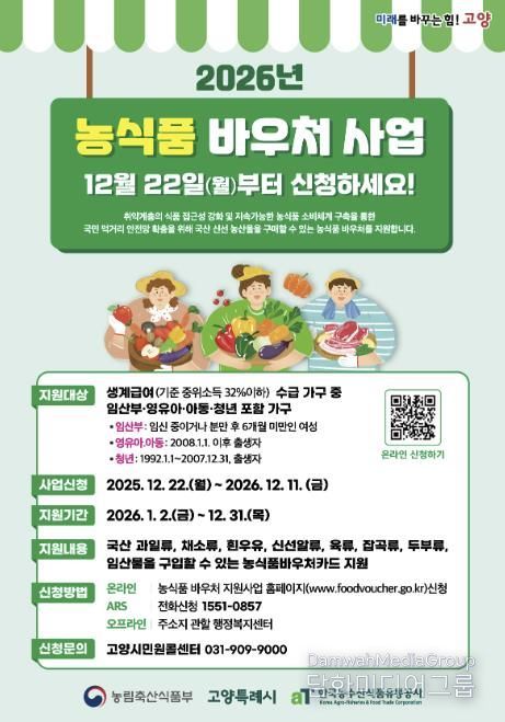 시민행정신문 강갑수 기자 | 고양특례시는 올해부터 지역 내 취약계층의 균형 잡힌 식생활을 지원하고, 농식품 소비 촉진을 돕기 위해 ‘농식품 바우처 사업'을 확대 시행한다고 13일 밝혔다.