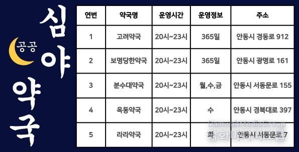 안동시 관계자는 “공공심야약국 운영을 통해 의약품 구입 불편을 해소하고 오남용을 예방하고자 한다”며 “심야 시간에도 안심하고 이용할 수 있는 신뢰받는 의약 환경 조성에 최선을 다하겠다”고 전했다.