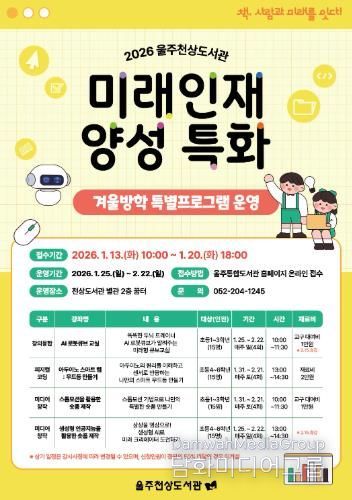 시민행정신문 강갑수 기자 | 울주천상도서관이 겨울방학을 맞아 오는 25일부터 다음달 22일까지 초등학생을 대상으로 ‘미래인재 양성 특화, 겨울방학 특별프로그램’을 운영한다고 13일 밝혔다.