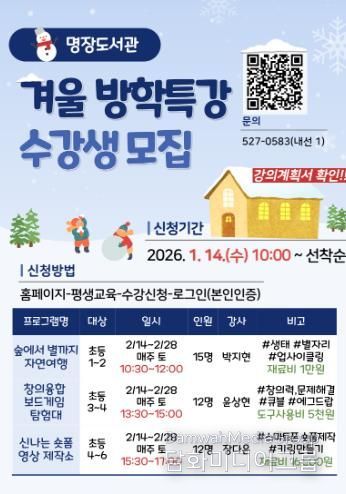 조수금 명장도서관장은 “이번 겨울방학 특강은 어린이들이 즐기며 체험하는 과정 속에서 자연스럽게 배움을 확장할 수 있도록 준비한 프로그램”이라며 “많은 어린이와 학부모의 관심과 참여를 바란다”고 말했다.