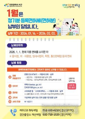 시민행정신문 강갑수 기자 | 인천 서구는 2026년도 1월 정기분 등록면허세 8만5천여 건, 28억9천4백만 원을 부과하고 올해 2월 2일까지 납부를 당부하는 등 적극적인 홍보에 나섰다.