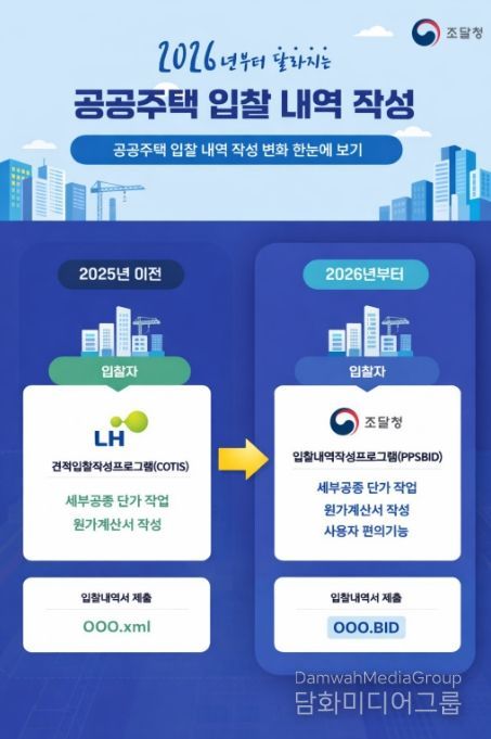 시민행정신문 강갑수 기자 | 조달청은 2026년부터 LH 공공주택 입찰 시 내역서를 ‘조달청 입찰내역작성프로그램’을 이용하여 작성해야 한다고 밝혔다.