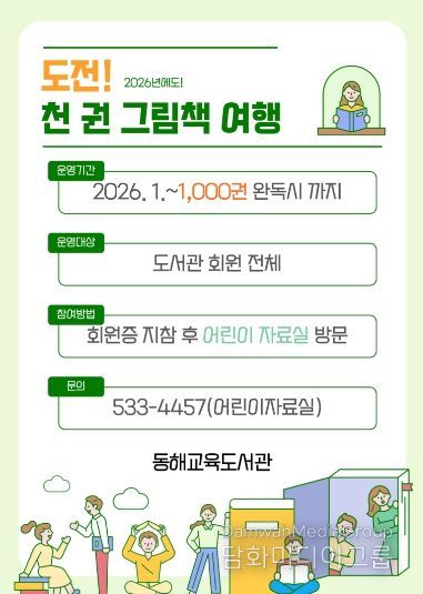 시민행정신문 기자 | 동해교육도서관(관장 안은희)은 지역주민의 정서적 공감능력과 상상력 증진을 위해 독서 프로그램 ‘도전! 천 권 그림책 여행’을 운영한다고 밝혔다.
