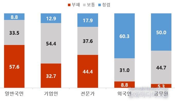 우리 사회가 ‘부패하다’라고 인식하는 비율은 일반국민(57.6%)이 가장 높았고 그 뒤를 이어 전문가(44.4%), 기업인(32.7%), 외국인(8.8%), 공무원(5.3%) 순으로 나타났다.