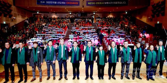 시민행정신문 강갑수 기자 | 보령시는 13일 보령문화예술회관 대공연장에서 ‘바람과 햇빛, OK만세보령의 미래가 되다’를 주제로 시민 800여 명이 참석한 가운데 RE100 비전선포식 행사를 개최했다.