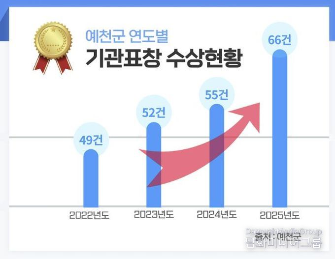 예천군 관계자는 “행정 환경이 빠르게 변화하는 가운데에서도 각 분야에서 기본에 충실한 행정을 추진한 결과, 수상 실적이 해마다 증가하는 성과로 이어지고 있다”며 “앞으로도 농촌과 도시가 균형 있게 발전할 수 있도록 군정 전반의 완성도를 높여 나가겠다”고 밝혔다.