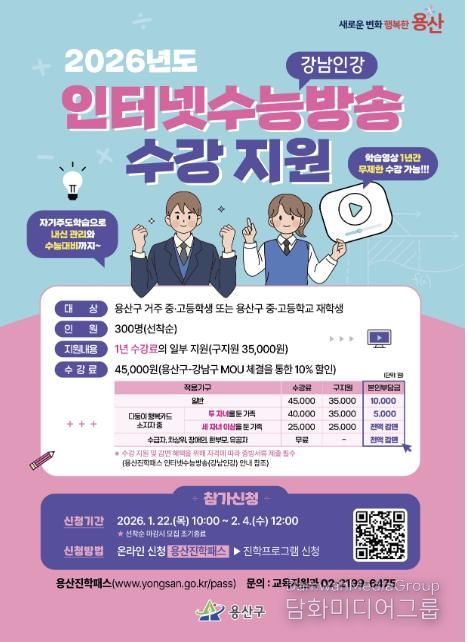 시민행정신문 강갑수 기자 | 서울 용산구가 1월 22일부터 2월 4일까지 ‘2026년도 인터넷수능방송(강남인강)’ 수강 지원 대상자 300명을 선착순으로 모집한다.