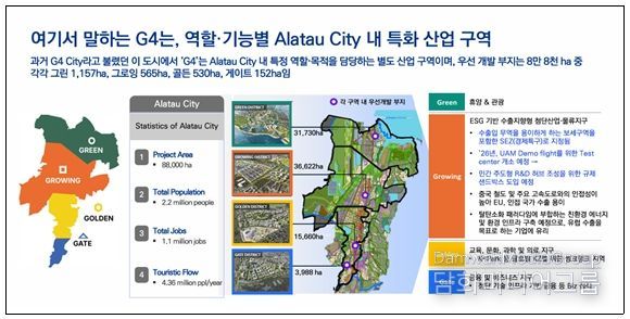 알라타우 시티는 카자흐스탄 알마티 북측에 조성 중인 대규모 신도시로, 금융·비즈니스, 의료·교육, 산업·물류, 관광·레저 등 기능별로 구분된 4개 특화 지구(G4)를 중심으로 개발이 추진되고 있다.