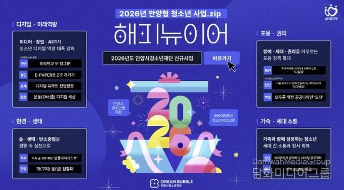 안병일 재단 대표이사는 “2026년 신규사업은 단순한 프로그램 확대가 아니라, 청소년이 스스로 선택하고 기획하며 사회와 연결되는 구조를 만드는 데 의미가 있다”며, “청소년의 오늘이 곧 안양의 내일이 되는 정책을 지속적으로 추진하겠다”고 밝혔다.